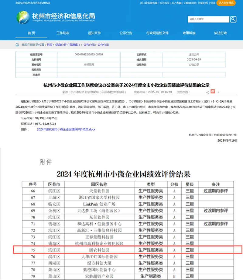近日,杭州市小微企业园工作联席会议办公室公布2024年度小微企业园绩效评价结果,浙农科创园再次获得三星A档绩效评价。